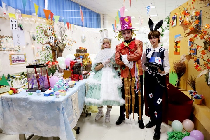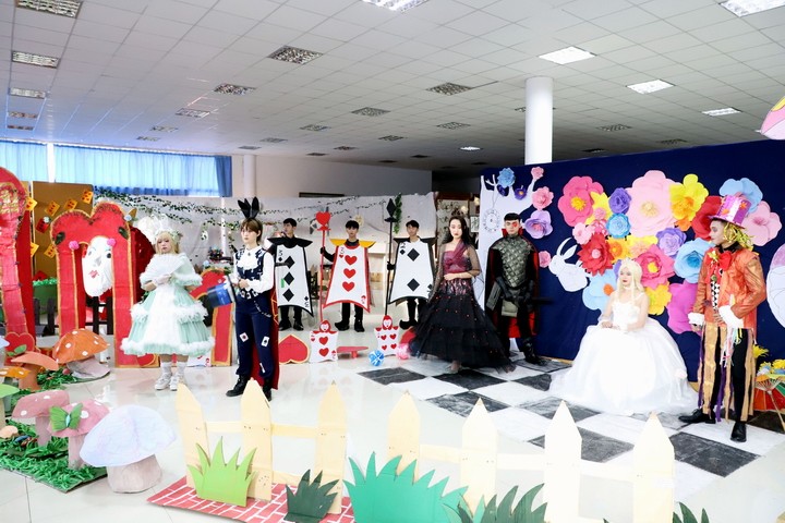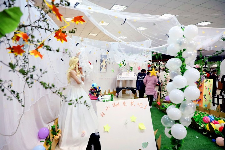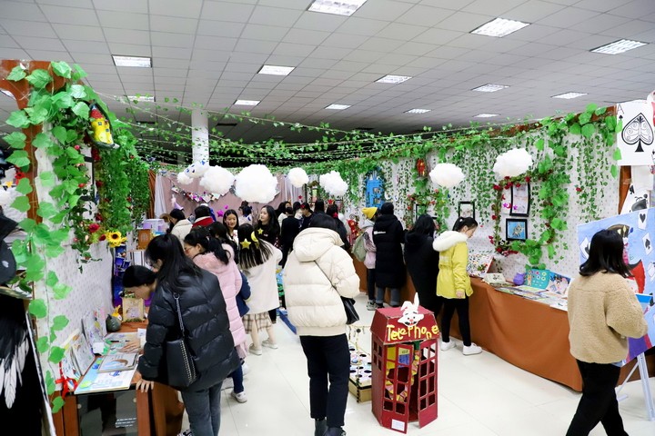 作品展以“夢回仙境,愛築學前”為主題,最大的特色就是用故事串聯的形式再現了動畫電影愛麗絲夢遊仙境場景,使人身臨其境,如夢如幻。展區的手工作品亦與主題布景相融合,選材配色敏銳,創作手法新穎,作品惟妙惟肖。礦泉水瓶、木棍、紙箱、麻繩等材料在同學們的手下得到充分利用,搖身一變成為了獨具特色的藝術品,從益智遊戲類玩具到匠心獨運的故事繪本,更有設計新穎獨特且适合兒童身心發展的自制玩教具等,各式各樣的展品組成了一道道亮麗的風景線,形象的展現了學前教育最新的教育教學理念,讓人耳目一新。