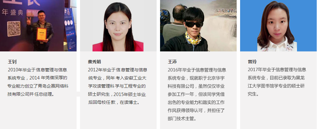 本專業于2016年獲批山東省優勢特色專業,師資團隊教育觀念新、改革意識強、教學水平高,獲得山東省專業評審專家組特别是每一屆畢業生的高度認可。“提高畢業生就業率且就業單位層次高”一直是專業辦學追求的核心目标之一,因此基于“校企融合、協同育人”辦學理念,專業和國際國内多家大型企業合作,如青島海信、金蝶、用友、甲骨文等,打造多種與企業深層合作模式,每個學期都會挑選部分學生由專業安排好教師,企業安排好師傅,兩位教師共同帶領參加企業實際訓練,全方位培養學生的實踐動手能力,校企合力打造“一體化人才供應鍊”,達到學生畢業到就業之間的0距離銜接,提升學生就業競争力,近幾年畢業生就業率一直保持100%。